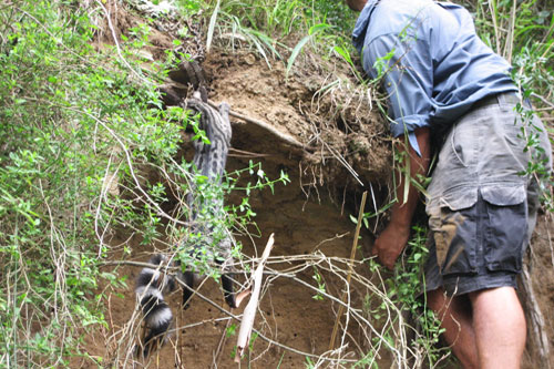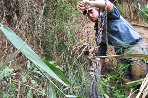 Whilst canoeing down a particular section of the river with guests, we noticed something strange on the river bank. Upon closer inspection, we saw a male spotted genet fighting for its life whilst being trapped in a jinn trap(trap for poachers). Luckily due to the fact that the poor animal was so tired from his struggle, we were able to get it free from the trap and place it in a safe container. The genet was then seen to by Darren from the Raptor and Reptile Centre in Addo, where its arm had to be amputated, but is now successfully rehabilitated and back in the wild.